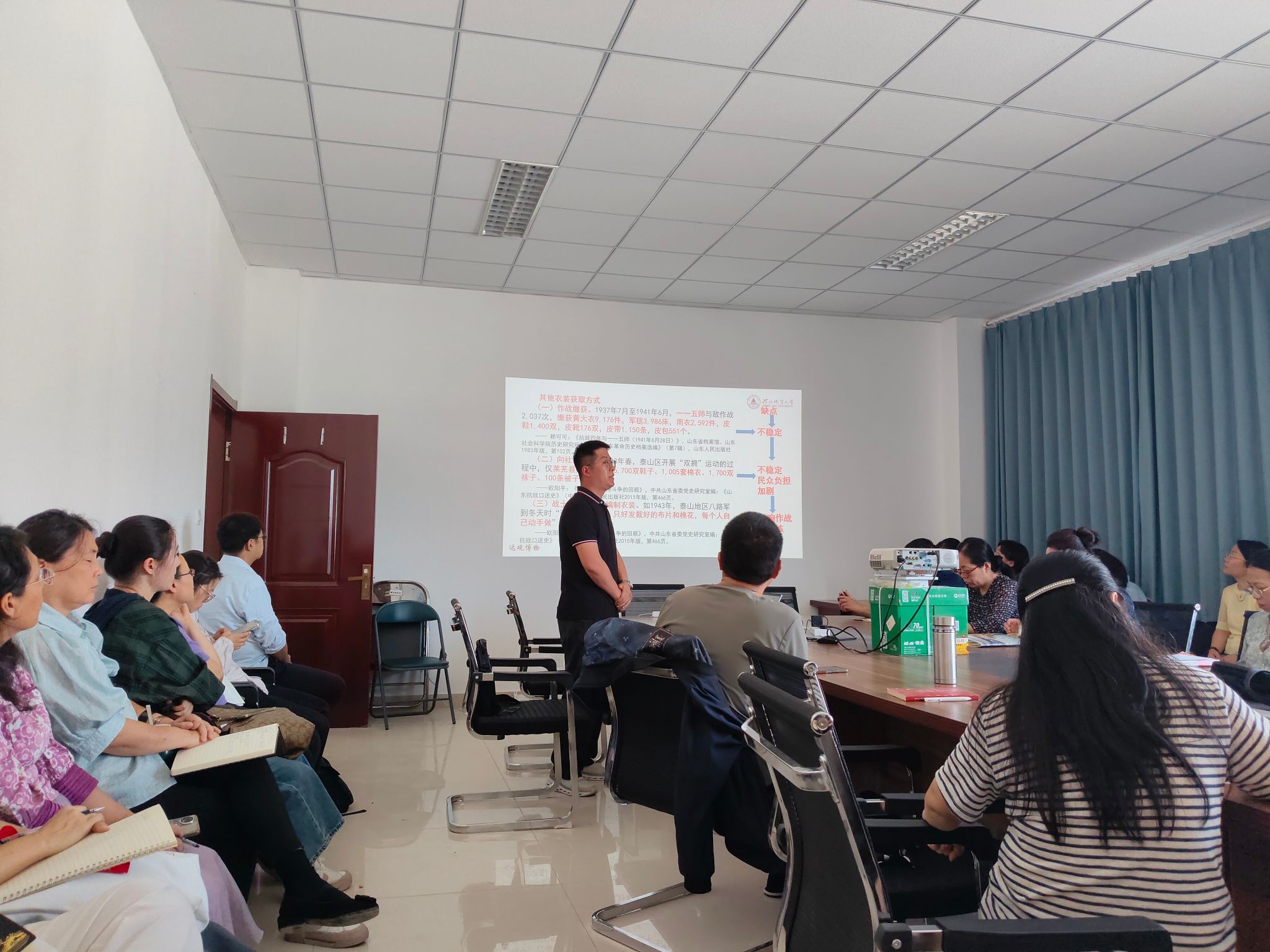 为隆重纪念中国人民抗日战争暨世界反法西斯战争胜利80周年,深切缅怀革命先烈的丰功伟绩,大力弘扬伟大的抗战精神,并深入贯彻落实习近平总书记关于思政课建设的重要指示批示精神,马克思主义学院于9月25日下午专门组织了抗战精神专题学习活动。由学院青年教师耿东旭作《钢铁是怎样炼成的:从衣食住行看山东八路军的抗战精神》主题报告,学院全体教师参加学习。报告共分为“山东八路军衣装供应”“山东八路军军粮供应”“山东八...