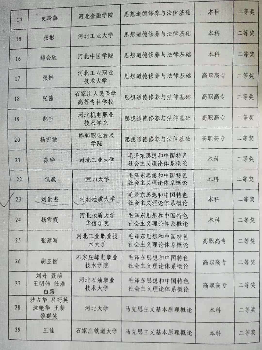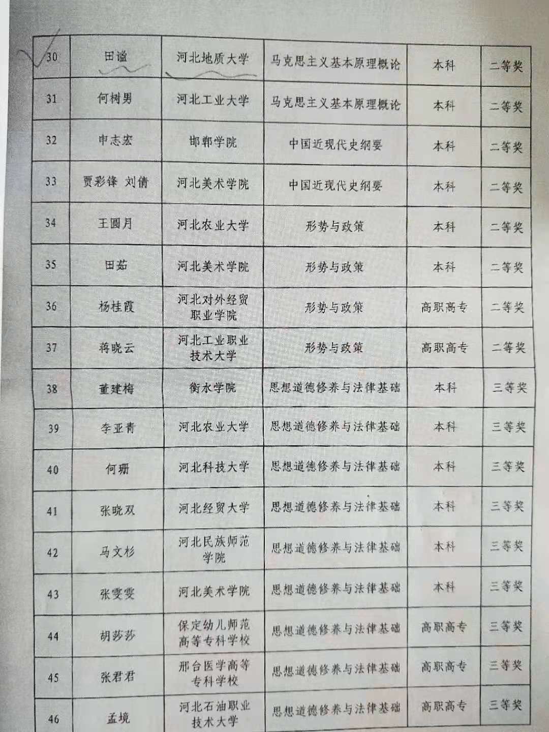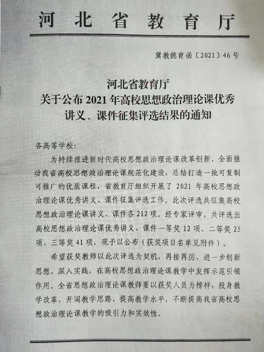 2021年3月,河北省教育厅组织了2021年高校思想政治理论课优秀讲义、课件征集评选工作。我校积极组织6名思想政治理论课教师参加。6月15日评选结果揭晓,马克思主义教学部刘素杰的《毛泽东思想和中国特色社会主义理论体系概论》荣获二等奖、田谧的《马克思主义基本原理概论》荣获二等奖。
